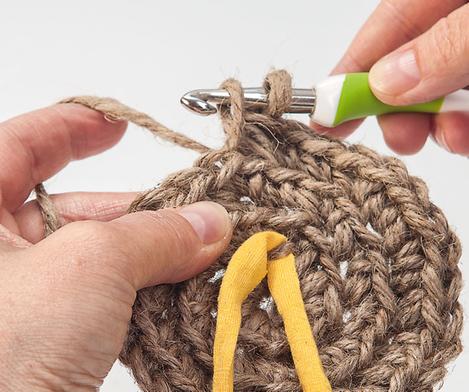 Dół koszyka przerobić na szydełku 4 oczka łańcuszka włóczką jutową i na szydełku nr 7.0, zamknąć oczkiem zamykającym tworząc pierścień. Dalej przerabiać spiralnie, tj. nie zamykając każdego pojedynczego oczka oczkiem zamykającym. Zaznaczyć początek rzędów kolorową nitką. przerobić na szydełku 8 oczek ścisłych w pierścień, następnie podwoić każde oczko. W następnym okrążeniu podwajać co 2 oczko, następnie co 3 oczko, co 4 oczko i tak dalej, aż do uzyskania pożądanego rozmiaru podstawy. Następnie odetnij przędzę jutową i schowaj nitkę. Wskazówka: W przypadku mocnej włóczki jutowej, łatwiej jest szydełkować tylko w tylne oczko. Tworzy to również ładny wzór reliefowy.