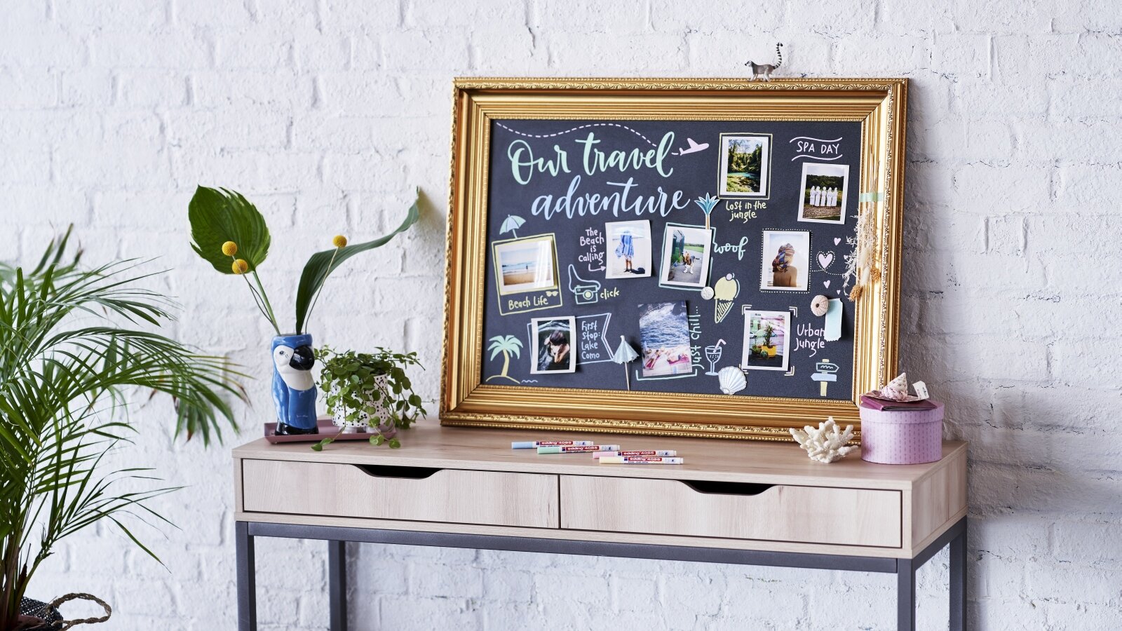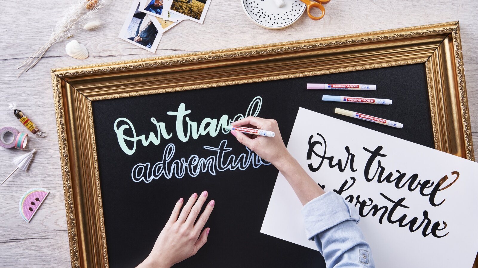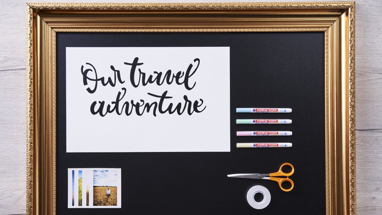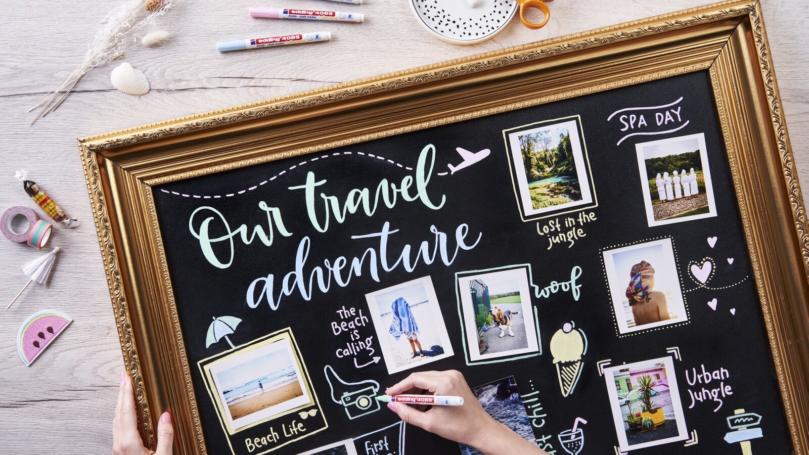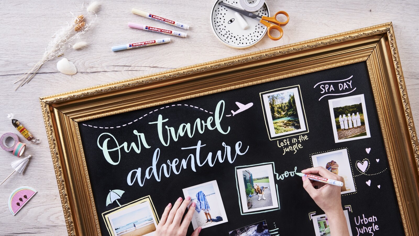 Istnieje wiele pięknych sposobów na uwiecznienie wspomnień z wakacji lub ekscytujących przygód. Na przykład ramka na zdjęcia z wbudowaną tablicą do pisania kredą, taka jak ta ramka w kolorze złotym, może być zaprojektowana na wiele sposobów. Czarną, gładką tablicę kredową można ozdobić zdjęciami i pisać po niej specjalnymi markerami kredowymi. Dzięki wyjątkowo precyzyjnym markerom kredowym Edding 4085 firmy Securit można z łatwością tworzyć krótkie teksty lub szczegółowe rysunki w 20 żywych kolorach, w tym w odcieniach pastelowych i metalicznych. Po udekorowaniu ramka na zdjęcia będzie przyciągać wzrok i stanie się ozdobą domu. A jeśli chcesz uchwycić nową atrakcję na ramce na zdjęcia, nie ma problemu, po prostu usuń zdjęcia i przetrzyj wzór wilgotną szmatką i przejdź do następnego projektu.
