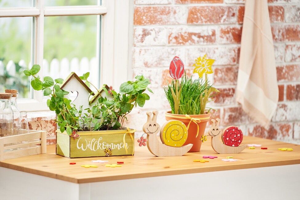 Najpierw pomaluj drewnianą miskę na rośliny, ślimaki VBS, drewniane zatyczki VBS i niektóre rozrzucone elementy bejcą do drewna. Przed kontynuowaniem pozostaw farbę do całkowitego wyschnięcia.