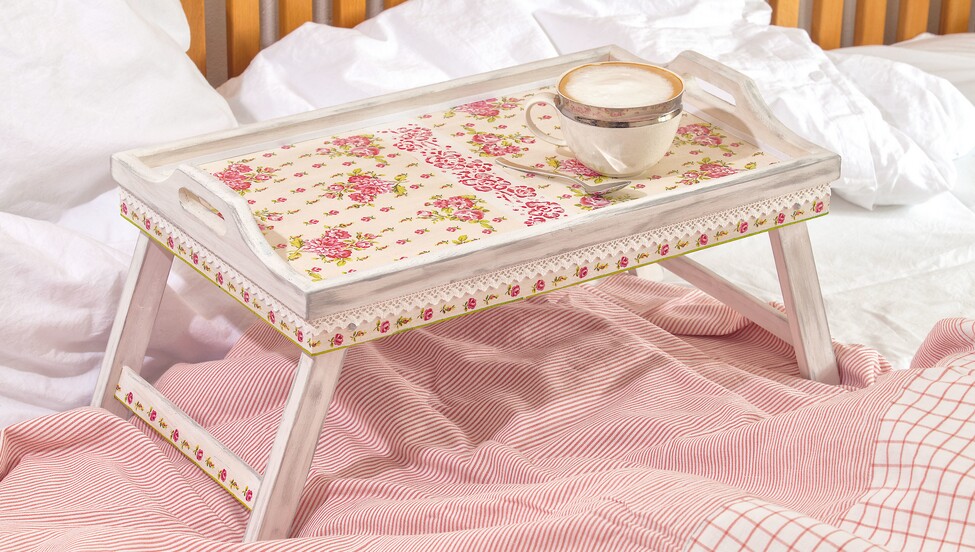 Ta duża, solidna taca stojąca jest idealna do projektowania techniką serwetkową. Dzięki małej sztuczce duże motywy można bez problemu przykleić na płasko. Będziesz chciał jeść śniadanie w łóżku każdego dnia.