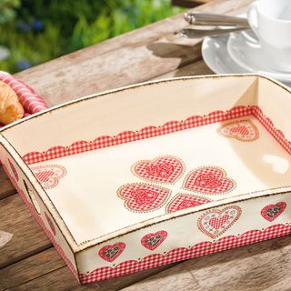 Ta romantyczna taca do serwowania w stylu wiejskim z dwoma pięknymi uchwytami w kształcie serca jest wykonana z wytrzymałego drewna. Dzięki dekoracyjnym zdobieniom i kolorom mogą Państwo zaprojektować swój dodatek do domu. Niezależnie od tego, czy będzie to podstawa do dekoracji, takich jak kompozycje kwiatowe w stylu shabby chic, czy do przechowywania pięknie ukształtowanych butelek octu i oleju w kuchni, ta taca jest idealna.