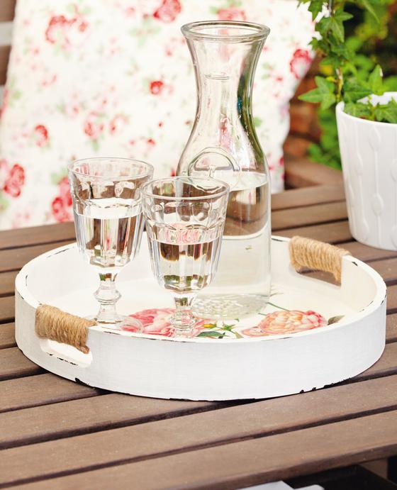Zagruntuj tacę gąbką malarską w kolorze białym i pozostaw do wyschnięcia. Wytnij kwiaty z nici z motywem słomy, umieść je na tacy i pokryj lakierem do serwetek. Owiń sznurek jutowy wokół uchwytów i zabezpiecz jego końce gorącym klejem. Podkreśl krawędzie ciemnym kolorem, nakładając go płaską stroną pędzla.