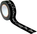 Piękna, samoprzylepna taśma maskująca "Wesołych Świąt i Szczęśliwego Nowego Roku" o długości ok. 10 m i szerokości ok. 15 mm. Napis "Życzymy Państwu Wesołych Świąt i Szczęśliwego Nowego Roku!" jest wydrukowany w kolorze białym na czarnej taśmie samoprzylepnej.