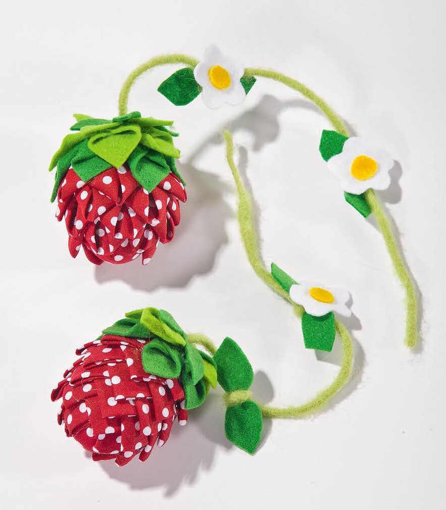 Przypnij kawałek wełnianego sznurka do truskawki (łodygi). Następnie wytnij kwiaty i słupki z białego i żółtego filcu oraz małe listki z zielonego filcu. Na koniec przymocuj je do sznurka za pomocą pistoletu do klejenia na gorąco.