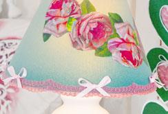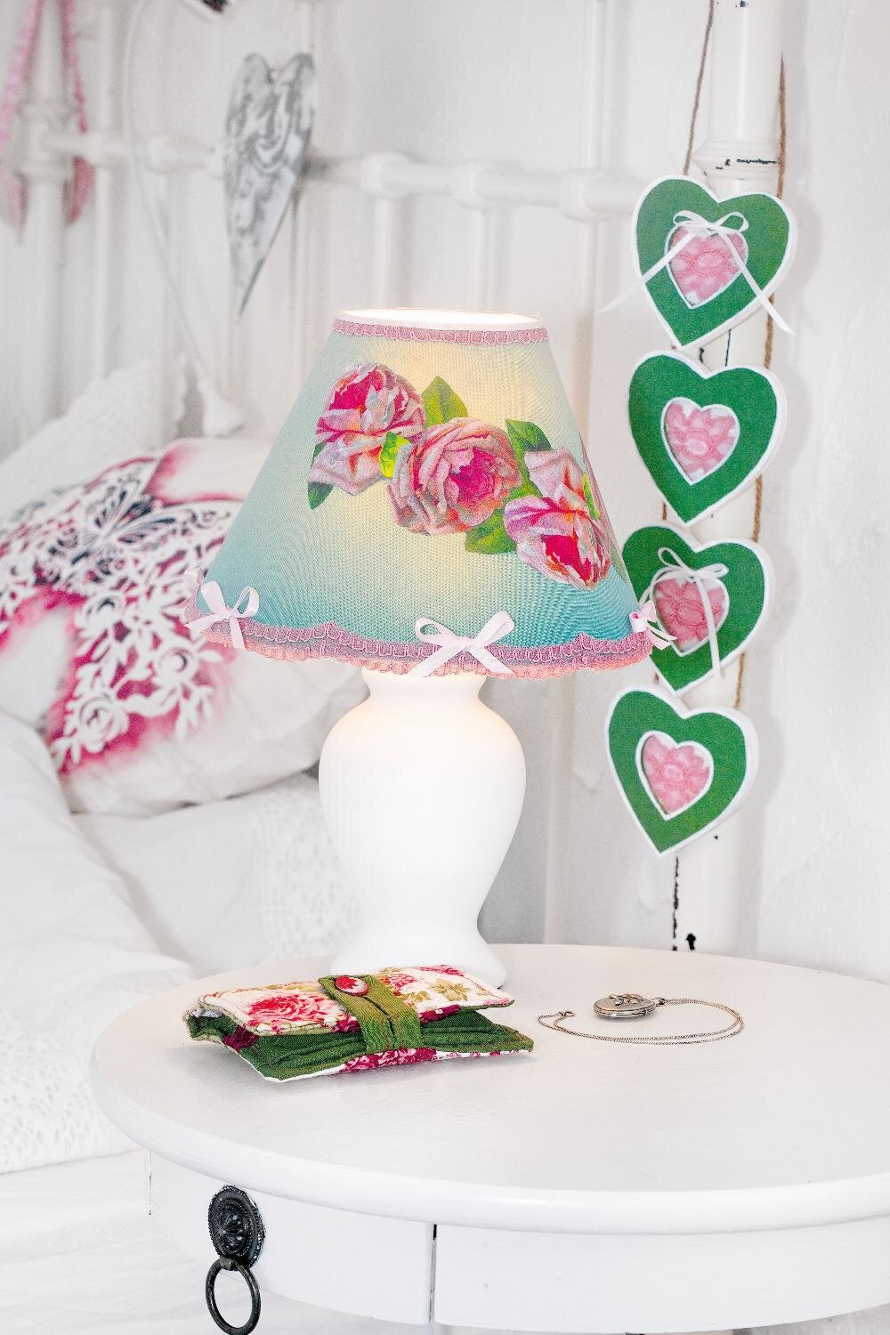 Ta piękna, romantyczna lampa pokryta jest tkaniną i koronką. Bujny zielony kolor tworzy efektowny kontrast z motywem róży na słomkowym jedwabiu. Udekoruj tę lampę stołową drobnymi detalami i uczyń ją swoją ulubioną.