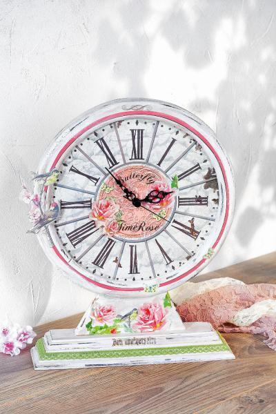 Aby nadać temu zegarowi stołowemu wyjątkowego uroku, przetrzyj krawędzie szaro-brązowym kolorem Hobby Colour i zabezpiecz wszystko lakierem do decoupage.