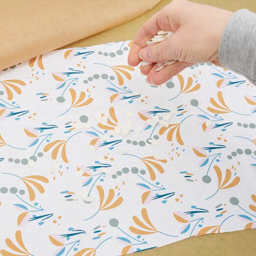 Aby zaimpregnować tkaninę, umieść kawałek materiału na papierze do pieczenia i posyp go pastylkami wosku pszczelego. Przykryj wszystko kolejną warstwą papieru do pieczenia.