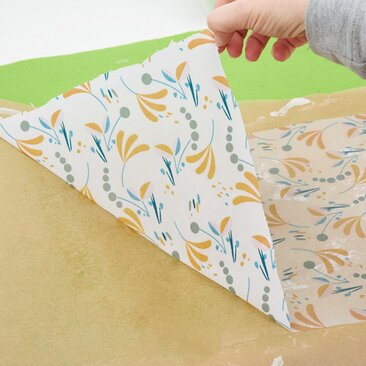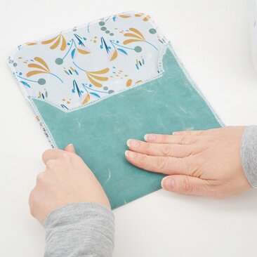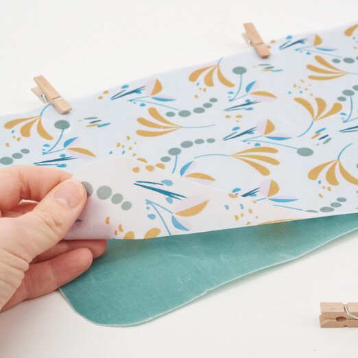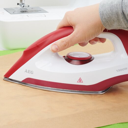 Teraz odwróć wszystko i przeprasuj tkaninę przez papier do pieczenia również z tej strony. Zdejmij tkaninę z papieru do pieczenia, gdy wosk jest jeszcze płynny.