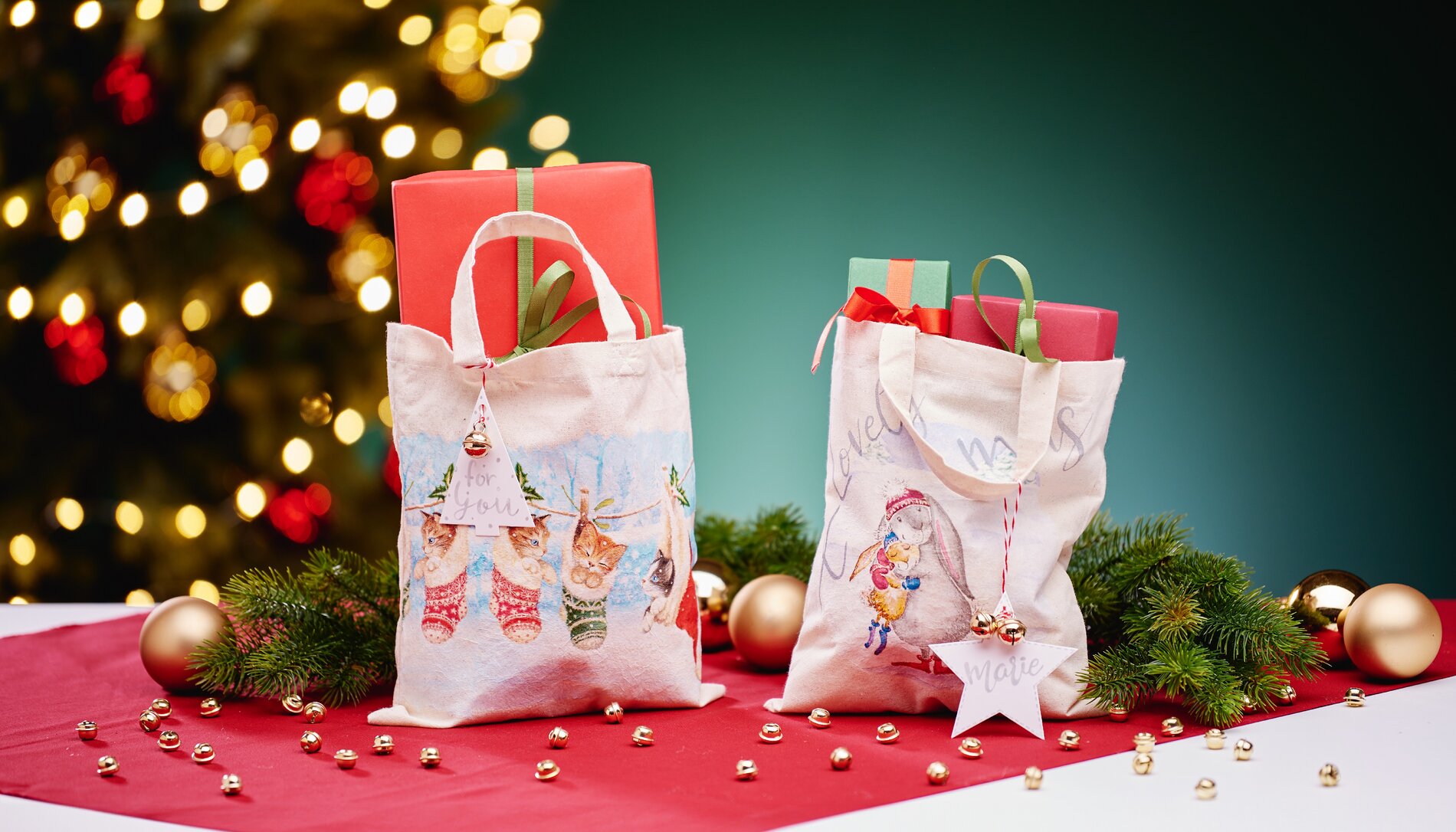 Zakończ pracę, etykietując przywieszkę prezentową i mocując ją do bawełnianej torby za pomocą sznurka i klipsa.