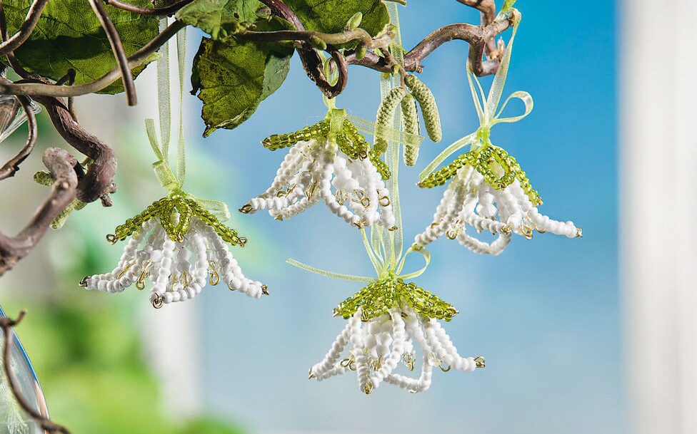 W ten sposób druciane gwiazdki i koraliki Rocaille stopniowo zamieniają się w piękne kielichy, przypominające przebiśniegi.