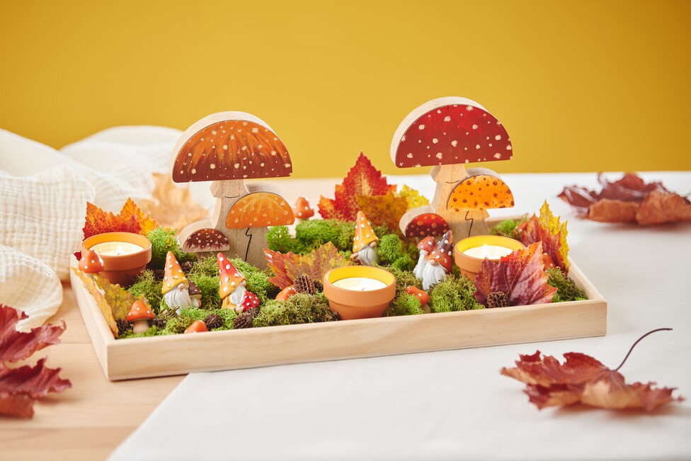 2. Ułóż dekorację na tacy: Gdy grzyby wyschną, umieść je na ładnej tacy. Teraz możesz rozpocząć tworzenie jesiennej scenerii. Użyj mchu, suszonych jesiennych liści i małych mini szyszek, aby uzyskać naturalny i żywy jesienny wygląd.