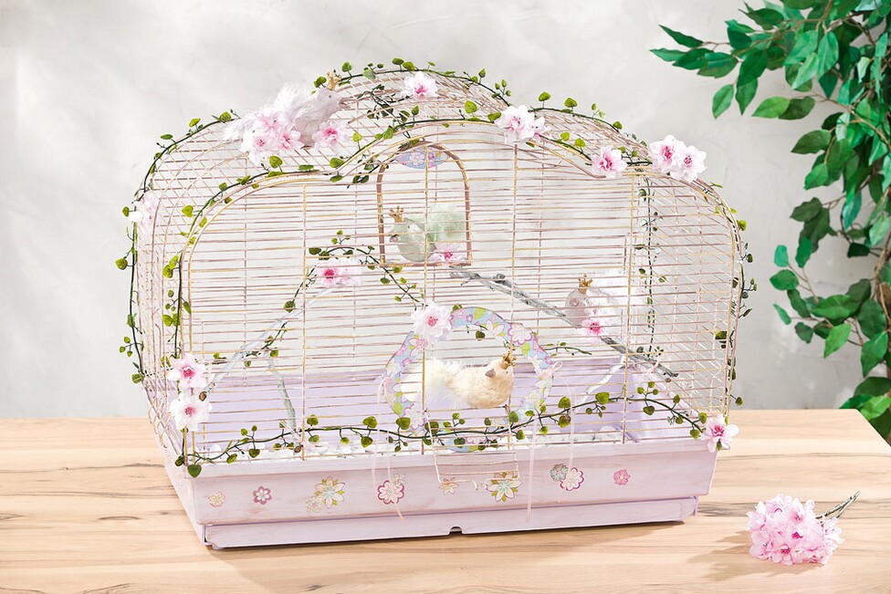 Udekoruj klatkę dla ptaków małymi ptaszkami, kwiatami i girlandami z liści według własnego gustu. Do tego celu można również wykorzystać starą (wyczyszczoną) huśtawkę dla ptaków.
