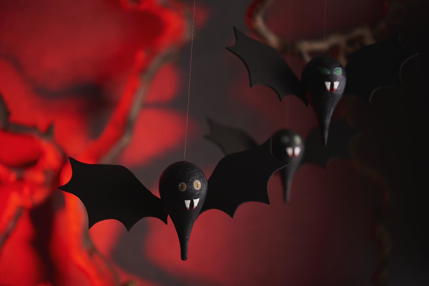czarny arkusz gumy piankowej, a następnie przytnij go do odpowiedniego rozmiaru. Przyklej skrzydła do akrylowych kropli pokrytych papierem krepowym.