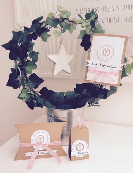 Wytnij kartę i upominek z papieru pakowego. Przedziurkuj końce prezentu. Oryginalne opakowanie jest dostępne w VBS. Wszystkie motywy są stemplowane i dziurkowane, a następnie mocowane za pomocą samoprzylepnych przekładek. Udekoruj wstążką i wydrukuj napis "Wesołych Świąt", wytłocz go lub napisz ręcznie. Gotowe ❤