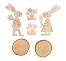 Motywy składają się z króliczków z kwiatami na krążkach kory. Poszczególne części i elementy dekoracyjne są mocowane na miejscu za pomocą kleju rzemieślniczego (brak w zestawie). Produkt jest niepomalowany i ozdobiony z jednej strony. Średnica krążka kory wynosi 8 cm, a całkowita wysokość 17 cm. Te naklejane motywy to piękna dekoracja i wyjątkowy prezent, który zachwyci Państwa bliskich. To świetny sposób, aby dać upust swojej kreatywności i spędzić kreatywnie czas.