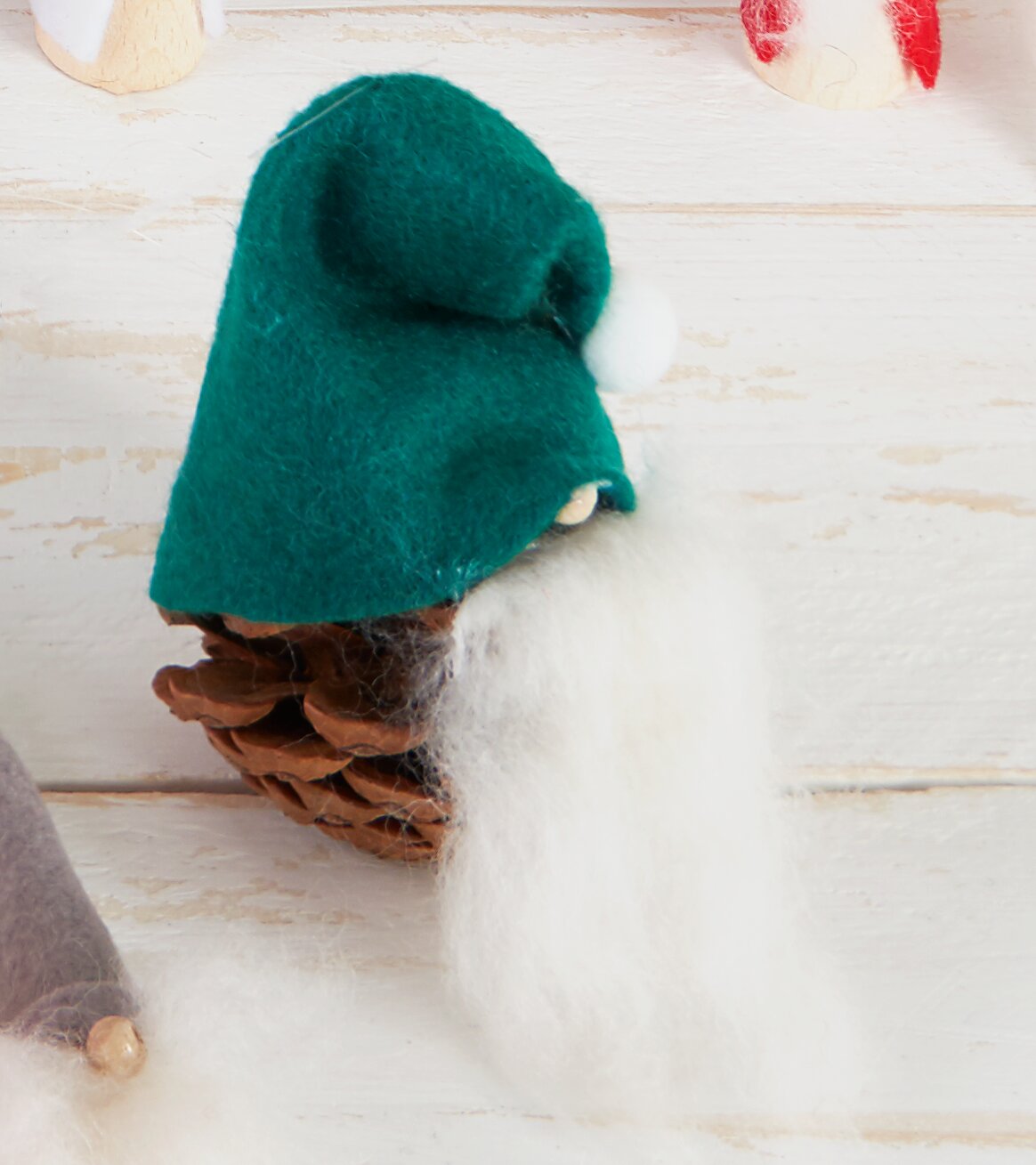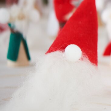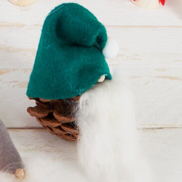 przenieś szablony różnych czapek i, w razie potrzeby, peleryn na filcowe palety i przytnij je do odpowiedniego rozmiaru. Przymocuj peleryny do stożków za pomocą sznurka konopnego. Skręć filc na kapelusze w stożek o wymaganym rozmiarze i przyklej końce kapelusza gorącym klejem. Przyklej pompon do czubka czapki. Teraz przyklej gotowe czapki do stożków figurek, bombek, kołków do ubrań lub szyszek. Aby uzyskać brodę, przyklej wełnę wróżki do elfa. Wskazówka: Jeśli lekko zagniesz jeden koniec wełny i przykleisz brodę do stożków, otrzymasz również wąsy!