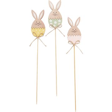 Otrzymają Państwo trzy pięknie zaprojektowane króliczki, które dodadzą odrobinę wiosennej magii do każdego pomieszczenia dzięki czarnym drucianym uszom i kwiecistym brzuszkom w pastelowym fiolecie, pastelowym różu i pastelowej zieleni. Zawieszki wykonane są z harmonijnego połączenia drewna MDF, sklejki, juty i drutu i są ozdobione z jednej strony, co nadaje im wyjątkowej głębi.