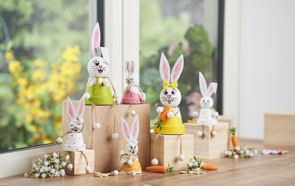 4 wstążki jutowe o długości ok. 10-15 cm dla każdego króliczka. Zawiąż węzeł na dole każdej wstążki i nawlecz na nią małą drewnianą kulkę. Następnie przymocuj ręce, nogi i głowę do glinianego naczynia za pomocą odrobiny gorącego kleju.