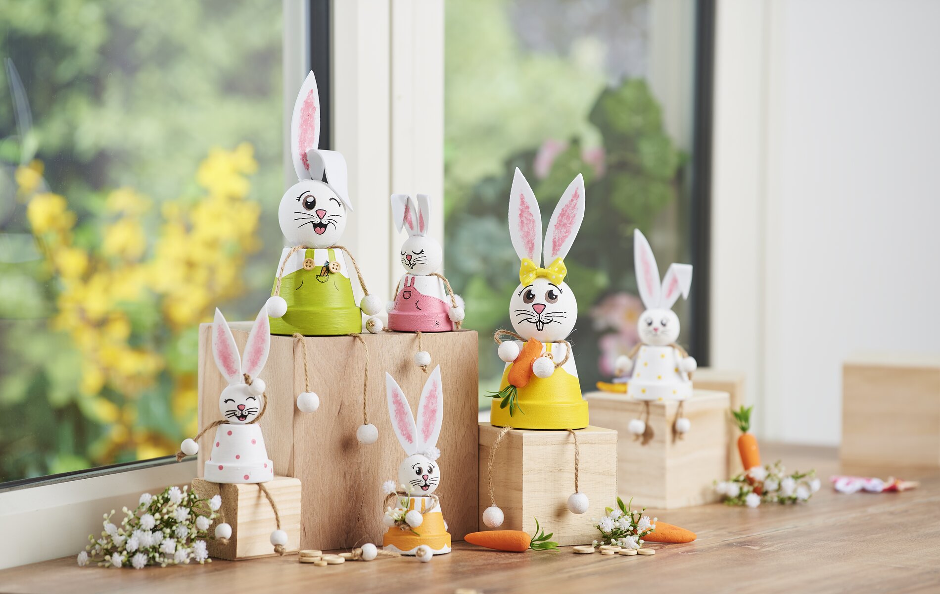 Na koniec, króliczki można ozdobić marchewkami, kokardkami, małymi kwiatkami, pomponami i guzikami.