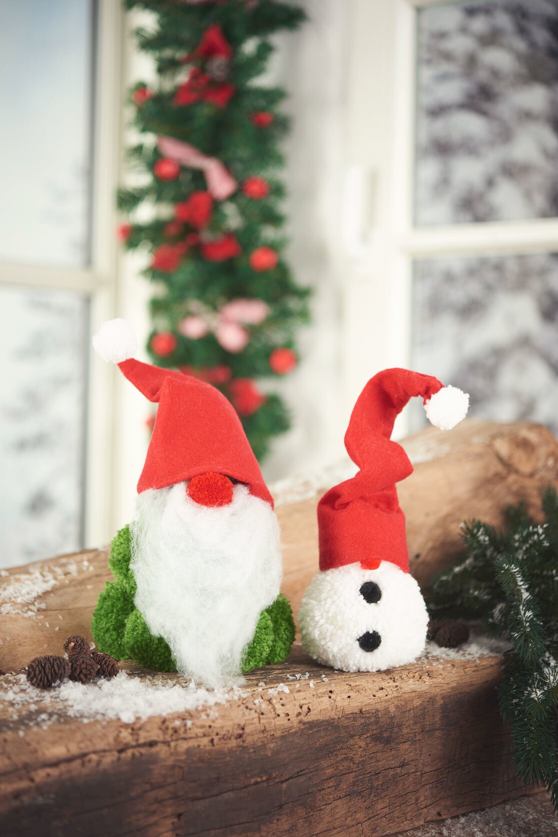 Aby zrobić czapkę Torge'a, najpierw wykonaj biały i czerwony pompon w rozmiarze mini. Następnie wytnij kawałek drutu o długości 20 cm i przymocuj go do białego mini pompona, przypinając go lub przyklejając. teraz przenieś szablon motywu czapki Torge na czerwony filc i wytnij go. Owiń filc wokół drutu jak spiczastą czapkę i sklej końce tak, aby końcówka kończyła się dokładnie w białym mini pomponie. Teraz możesz ostrożnie włożyć zrobioną spiczastą czapkę w górny pompon choinki i przymocować ją.