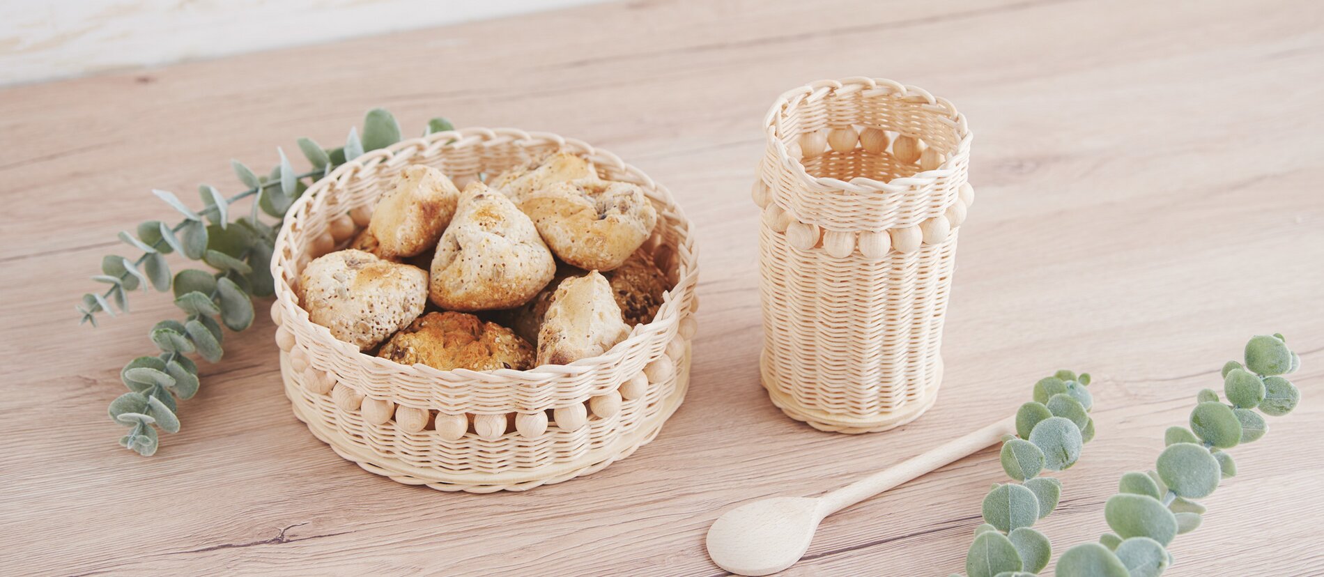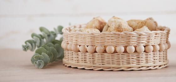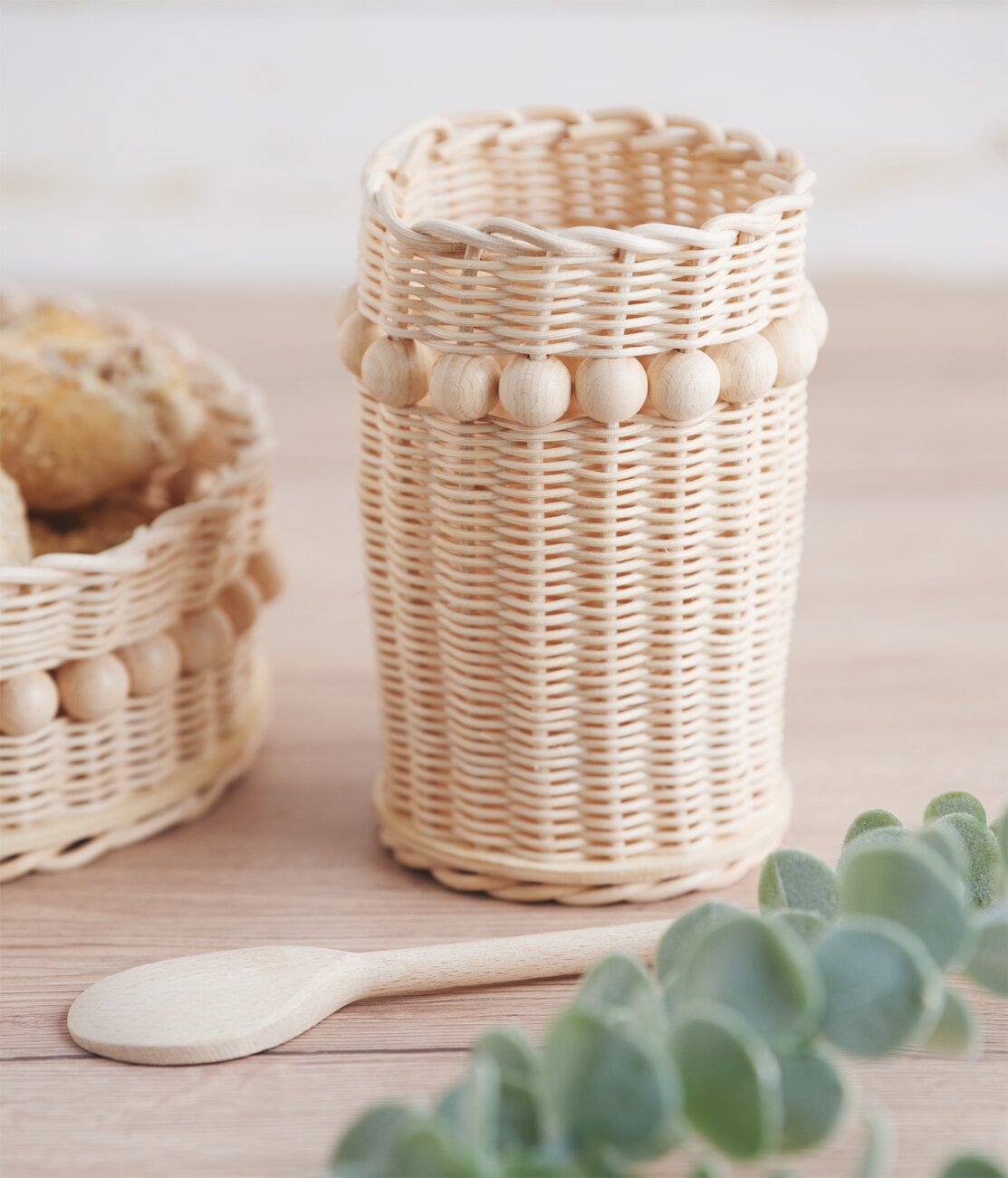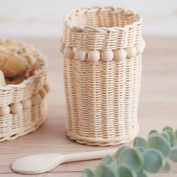 Namocz cienkie nitki w wodzie, aż będą wystarczająco elastyczne, aby można je było łatwo zginać. Weź pierwszą nitkę i umieść ją za pierwszym z pionowych palików, przed kolejnym, za przedostatnim.. Gdy tylko jedna nitka zostanie wpleciona, kontynuuj pracę w ten sposób z następną, aż osiągniesz wysokość około 2 cm. Umieść po jednej drewnianej kulce na każdej nitce. Po przymocowaniu wszystkich drewnianych kulek, zacznij od nowa, owijając cienkie pasmo wokół każdej pojedynczej nitki. Upewnij się, że początkowy kawałek jest skierowany do wnętrza koszyka, nadmiar zostanie odcięty później. Opleć kolejne 2 cm wysokości.