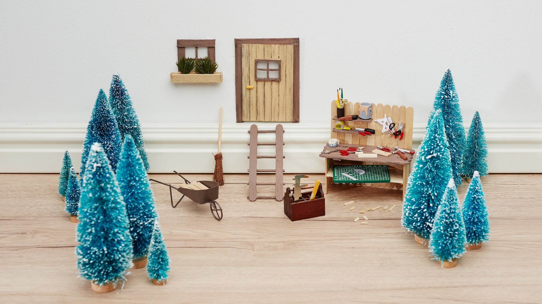 Najpierw wytnij nożyczkami drewniane szpatułki i patyczki rzem ieślnicze i sklej je ze sobą, aby utworzyć stół warsztatowy, drzwi i okno za pomocą kleju rzemieślniczego.