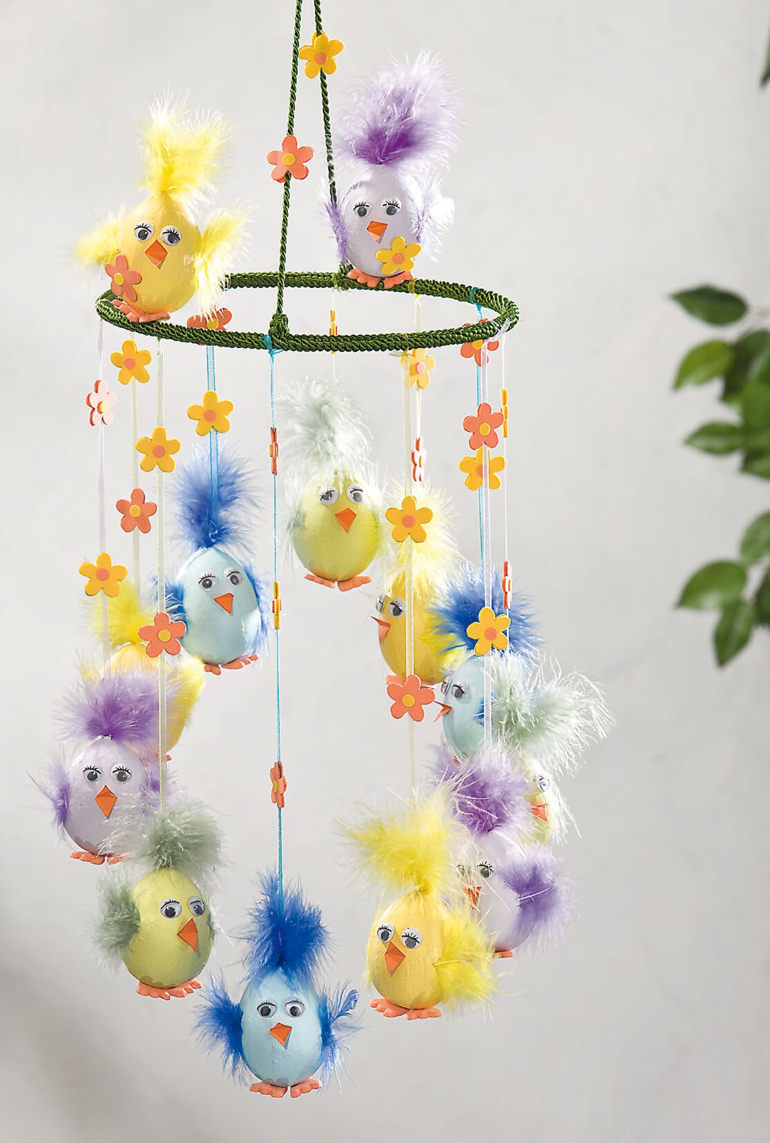 Teraz robi się trochę trudniej. Przywiąż wstążki do pierścienia tak, aby każdy kurczak wisiał nieco niżej niż jego sąsiad. Przyklej dwa kurczaki, które nie otrzymały wstążki, do pierścienia za pomocą gorącego kleju . Uważaj, aby nie poparzyć sobie palców! Następnie przyklej małe kółka do kwiatów za pomocą kleju z gumy piankowej i zawsze przyklejaj dwa razem na wstążkach, a stworzysz wspaniałego kurczaka mobilé.