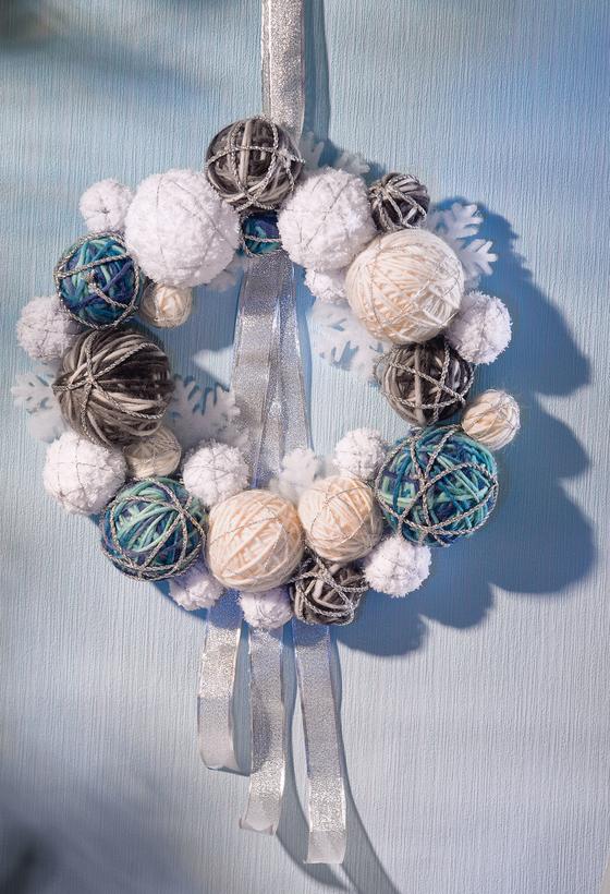Styropianowe kulki wyglądają prawie jak śnieżki, gdy są owinięte wełną. W ten sposób powstaje piękny wieniec, który może wisieć na drzwiach lub ścianie przez całą zimę jako niezwykła dekoracja.