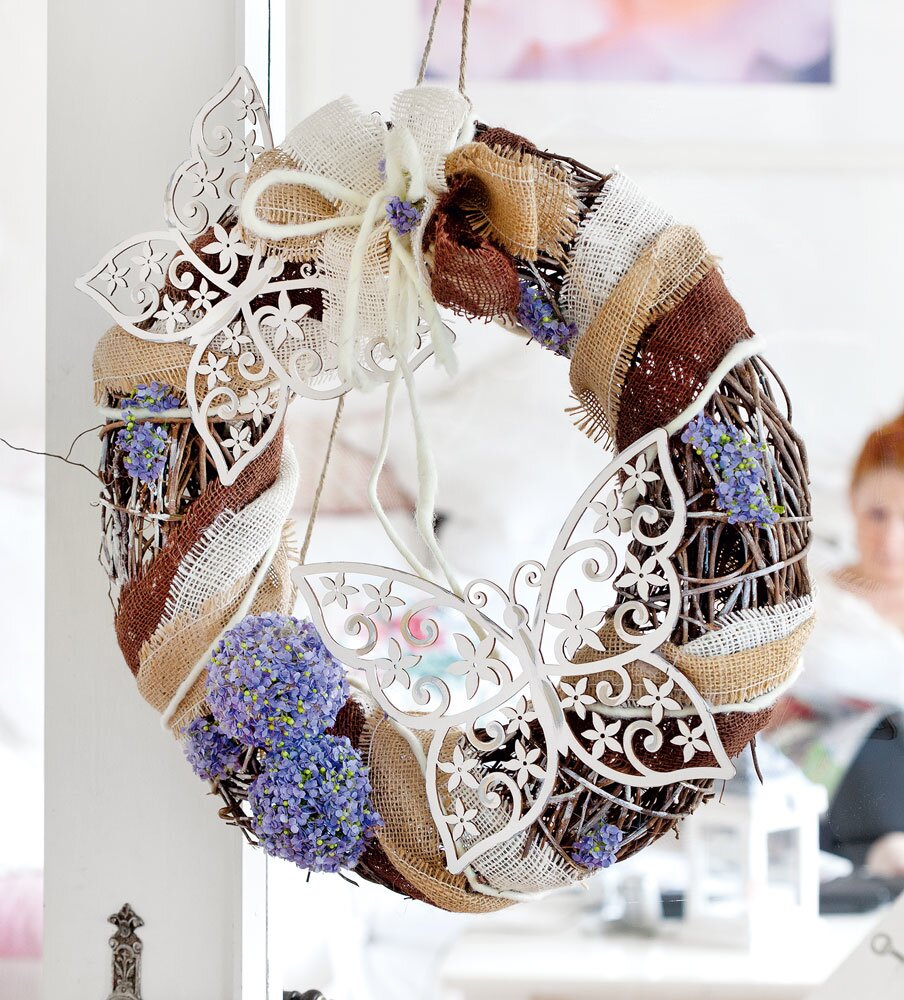 Zagruntuj motyle na biało i po wyschnięciu pomaluj je szarą farbą. Ułóż wszystkie trzy jutowe wstążki jedna na drugiej, zawiąż je wokół wieńca i zabezpiecz. Wolne przestrzenie pomiędzy nimi pomaluj na biało i pozostaw do wyschnięcia. Zrób kokardę z jutowych wstążek, zabezpiecz ją drutem i przywiąż do wieńca. Umieść motyle, przyklej je do wieńca, wytnij alium i przyklej baldachim. Odetnij pozostałe kwiaty i przymocuj je dekoracyjnie.