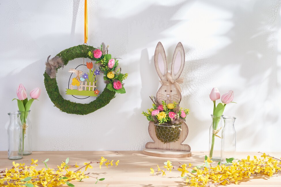 Najpierw pomaluj drewniany wieszak VBS "Wesołych Świąt" i uszy króliczka VBS w drucianym koszyku jasnymi kolorami VBS. Po wyschnięciu nadaj krawędziom i konturom cienistą głębię, kilkakrotnie wcierając tusz w poduszkę suchym pędzlem o twardym włosiu, a następnie ostrożnie przeciągnij pędzlem wzdłuż konturów. Tuszem do stemplowania pokoloruj również oczy postaci. Delikatnym białym markerem Posca narysuj źrenice i linie napisów. Dla dodatkowej ochrony, po wyschnięciu pokryj drewniane figurki lakierem akrylowym VBS.