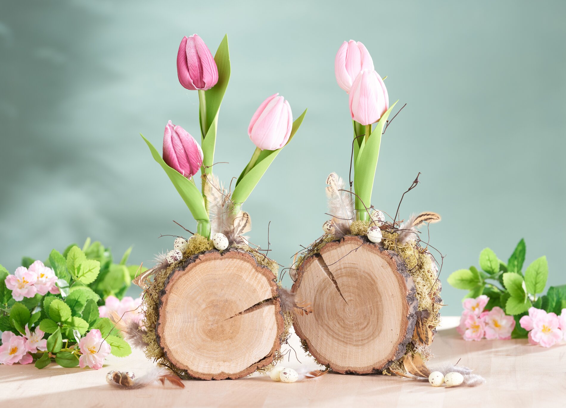 Gdy wszystko wyschnie, wypełnij luki odpowiednim mchem islandzkim. Następnie udekoruj krążki wierzbą, piórami i jajkami. Na koniec możesz umieścić tulipany w probówkach.