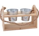 Piękny drewniany wieszak na doniczki VBS z 2 cynkowymi doniczkami i jutowym sznurkiem. Wieszak na doniczki wykonany jest z drewna o wymiarach ok. 28,5 x 13 x 19 cm i grubości ok. 1 cm. Doniczki cynkowe mają średnicę ok. 10 cm na górze i 7,1 cm na dole. Średnica wewnętrzna na górze wynosi ok. 9,5 cm. Gruby sznurek jutowy o długości ok. 60 cm jest przymocowany do górnej części drewna.
