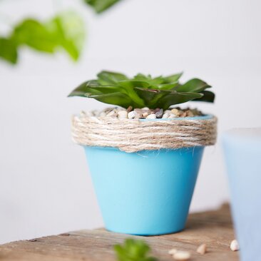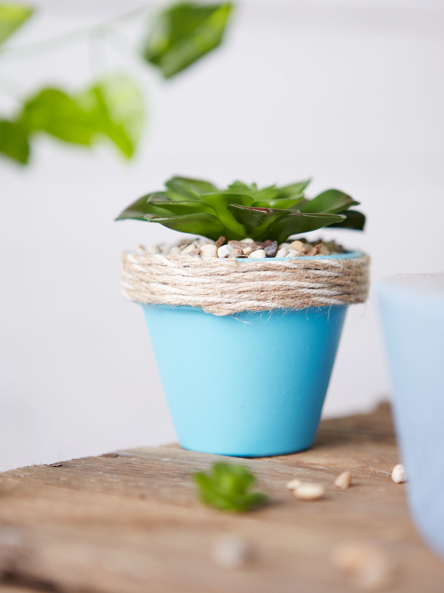 Najpierw pomaluj doniczki na dowolny kolor za pomocą farby w sprayu Marabu i pozostaw farbę do wyschnięcia. Następnie przyklej dwustronną taśmę klejącą do górnej krawędzi doniczek z terakoty i owiń wokół nich sznurek jutowy.