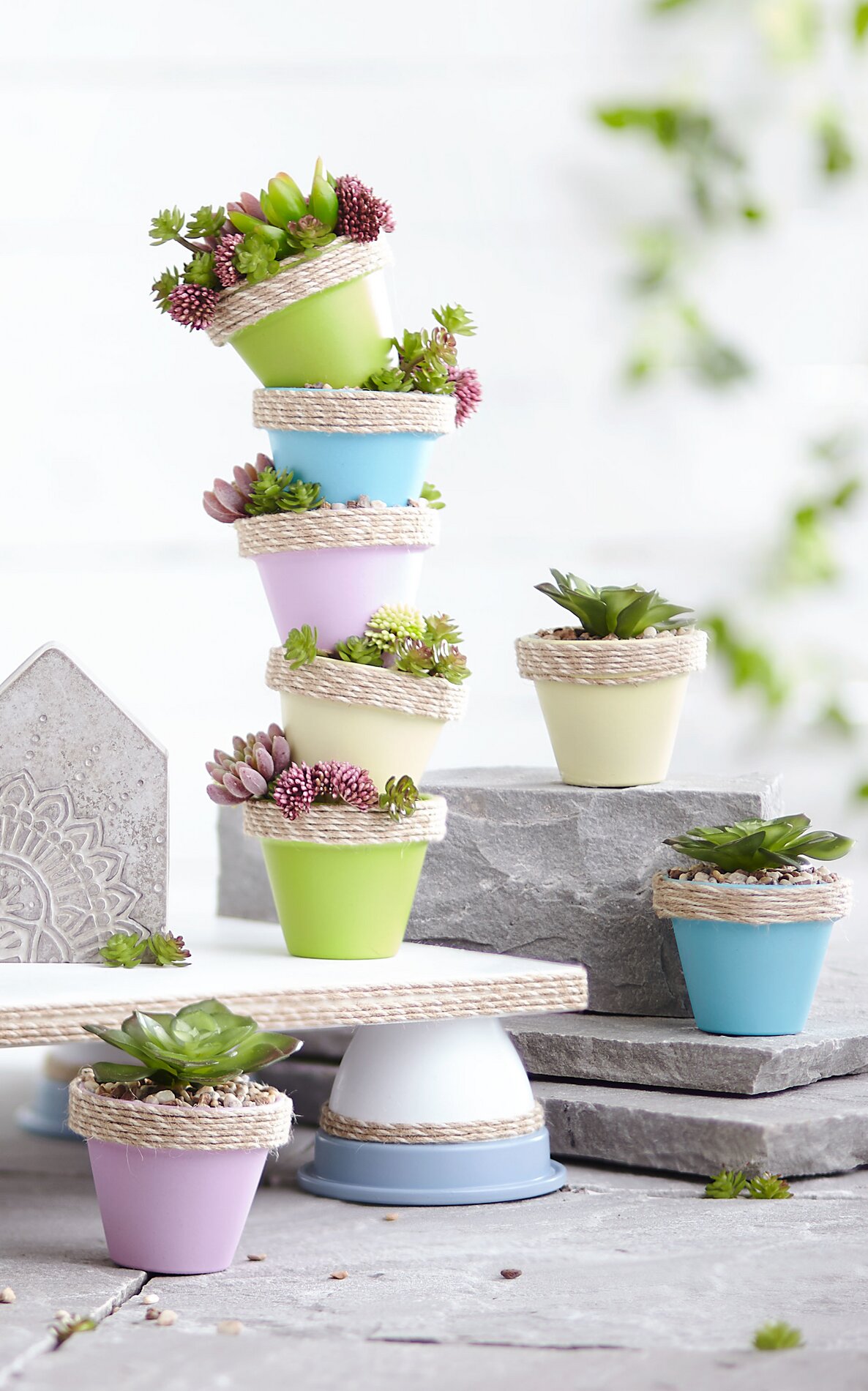 W tym pomyśle doniczki z terakoty są ułożone dekoracyjnie jedna na drugiej. Każda doniczka ma średnicę 7/8 cm na górnej krawędzi i stoi lekko przechylona na krawędzi dolnej doniczki.