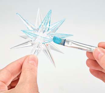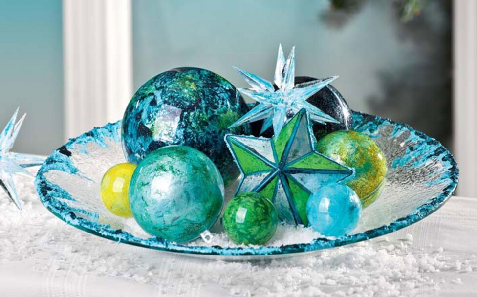 Po wyschnięciu pomaluj dekoracyjny śnieg turkusową farbą rzemieślniczą i pokryj go pastą brokatową w kolorze kamienia księżycowego. Przykryj podstawę szklanej miski diamentowym śniegiem i ułóż dekoracyjnie akrylowe bombki i gwiazdki.