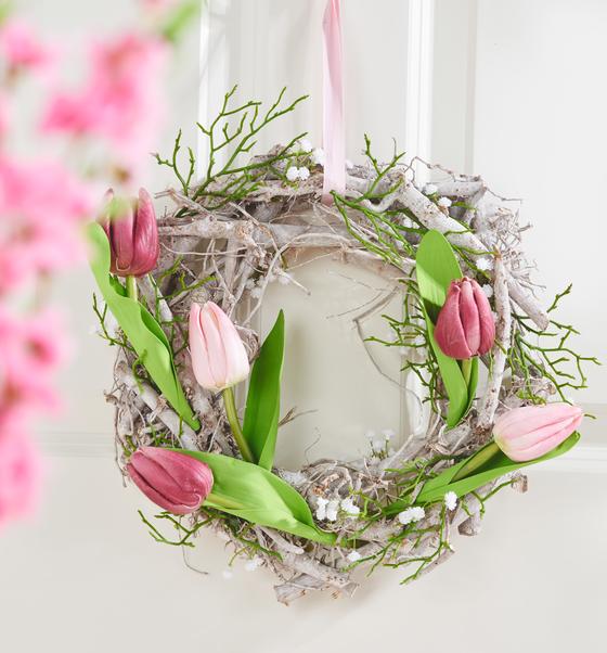 Ułóż tulipany, gipsówkę i gałązki borówki na wieńcu według własnego gustu. Przymocuj wszystko na miejscu za pomocą gorącego kleju.