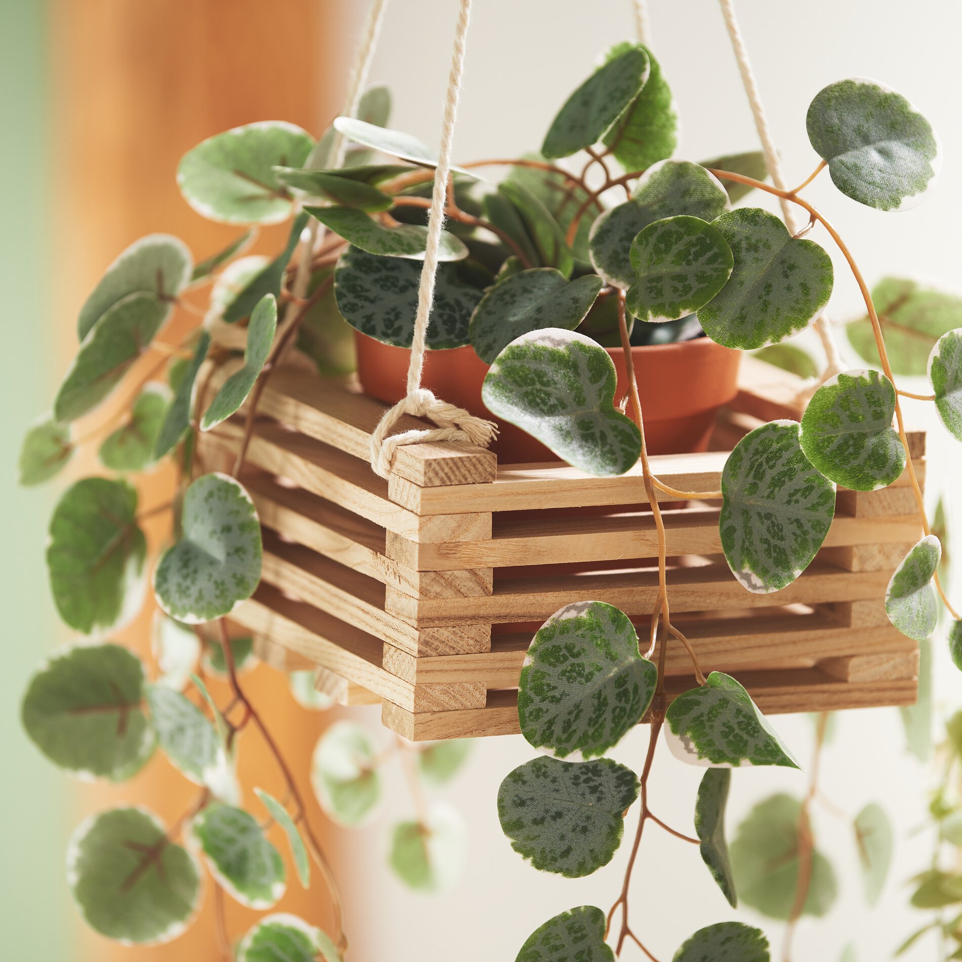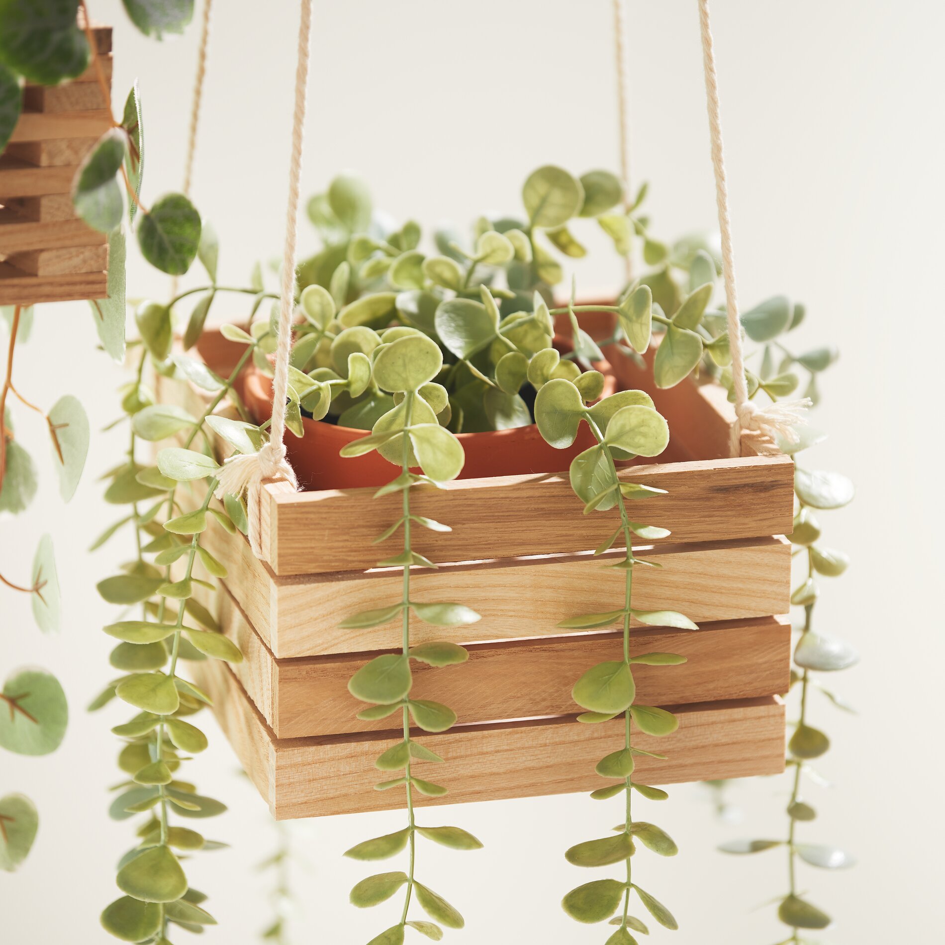 Przyciąć kawałek wstążki makramowej do preferowanej długości. Przywiązać jeden koniec wstążki do wybranego klocka, tworząc pętlę u góry. Proszę związać obie pętle razem. W ten sposób można później łatwo zawiesić wiszący kosz.