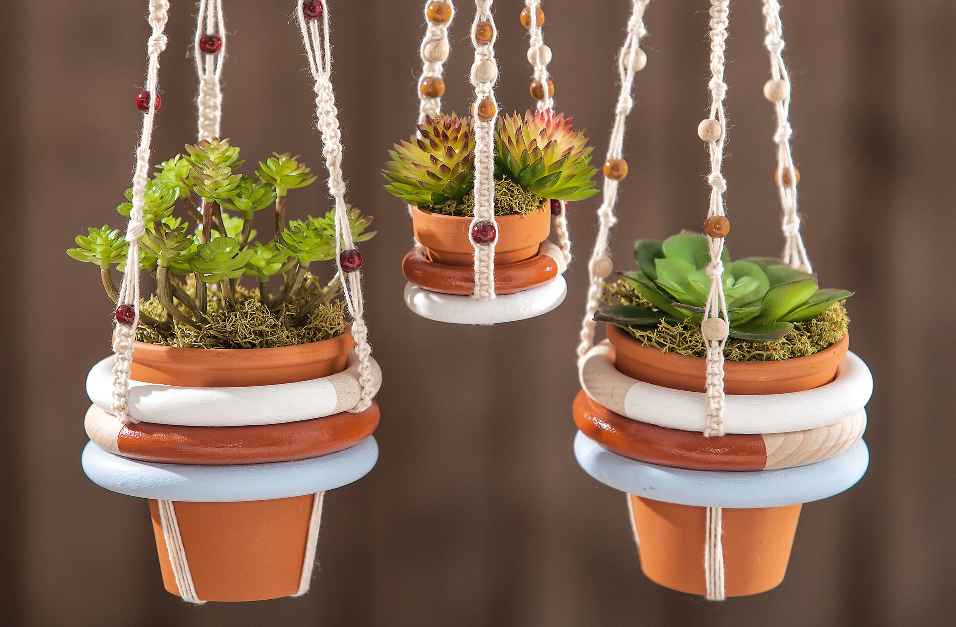 Układ kilku doniczek wygląda szczególnie interesująco, jeśli jedna z nich jest również ozdobiona malowanymi drewnianymi pierścieniami.