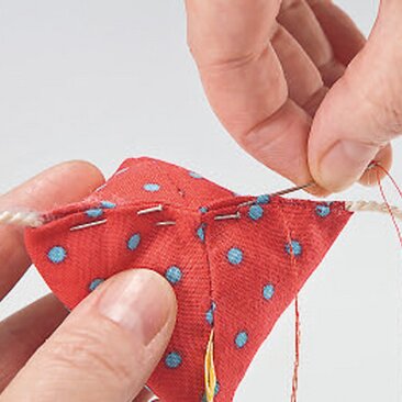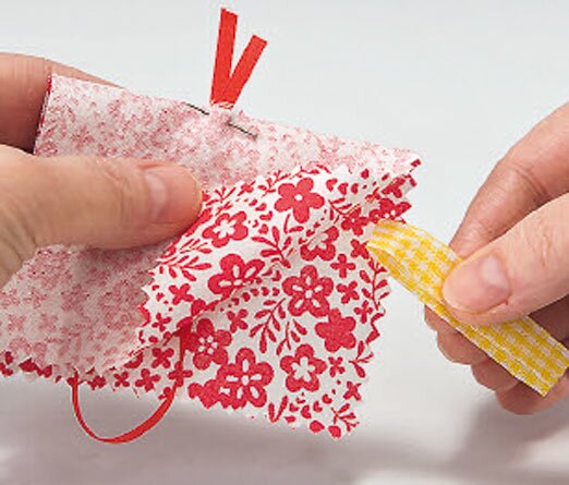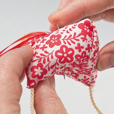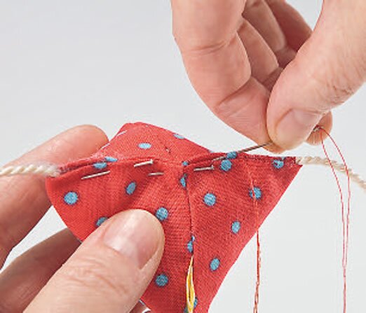 Przeciągnij nić do szycia przez ptaka od dołu, napnij nić, aby nadać ptakowi kształt . Następnie przyszyj wiszącą wstążkę do ptaka.