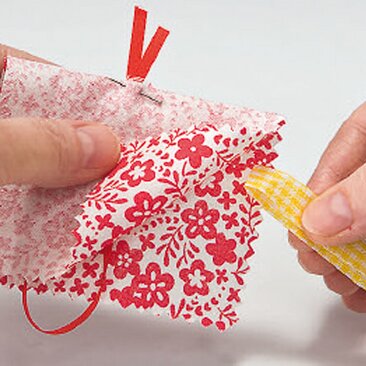 Aby wykonać dziób , złóż kraciastą wstążkę na pół i umieść ją po przekątnej wewnątrz materiału złożonego prawymi stronami do siebie.