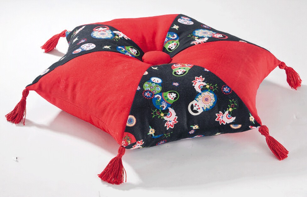 Na tej dużej, zachęcającej poduszce kolorowy wzór tkaniny połączono z wyrazistą czerwienią. Panel poduszki składa się z sześciu pojedynczych części z zaledwie kilkoma szwami i jest gęsto wypełniony wypełnieniem. Ozdobne guziki i frędzle nadają poduszce wyjątkowy wygląd.