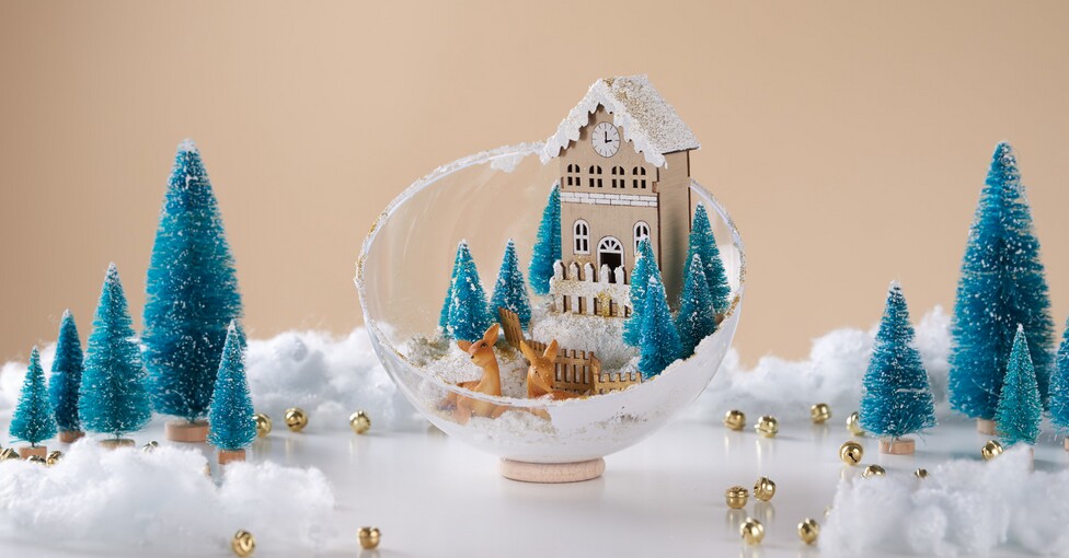 W tym pomyśle śnieżny krajobraz, dom i akcesoria są umieszczone w akrylowej kuli.