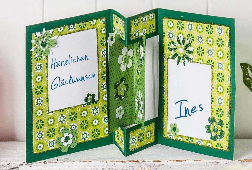 Odmierz 3 cm od krawędzi na górze i na dole środkowego pola, aby można było wyciąć pole o wymiarach 9 x 10,5. Wykonaj nacięcia w tym wycięciu i w wyciętym elemencie o określonych wymiarach. Następnie złóż wycięcie wzdłuż na środku i włóż je na górze i na dole. Kartkę można teraz dowolnie ozdobić, a przykładowe wymiary kartonowych wycięć można znaleźć w instrukcji. Wytnij kwiaty z papieru z motywem i przyklej je jeden na drugim, aby utworzyć kwiat Wskazówka: Niektóre papiery są białe z tyłu, więc nie potrzebujesz dodatkowego białego papieru.