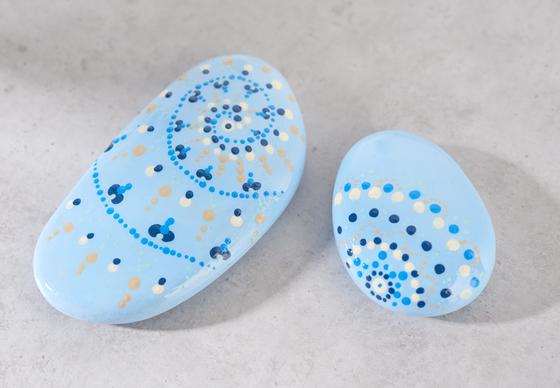 Okrągłe drewniane patyczki są używane do malowania kropek: wystarczy zanurzyć okrągłą końcówkę w farbie, a następnie nałożyć kropki - tutaj w falistych liniach. Różne grubości drewnianych patyczków skutkują różną grubością kropek.