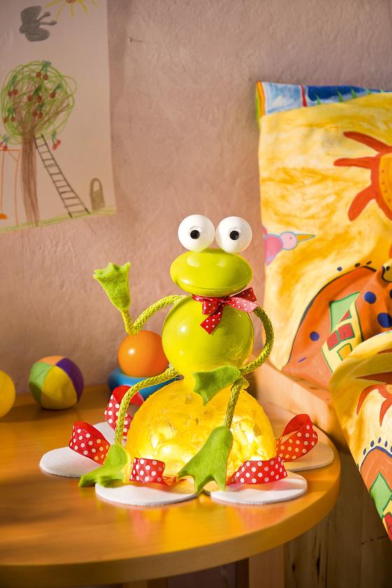 W przypadku rąk i nóg użyj pistoletu do klejenia na gorąco, aby wytopić otwory w środkowej kuli, usuń zadziory i przyklej drut figurki. Przyklej dłonie i stopy, przymocuj dużą kulkę do filcowego kwiatu za pomocą tarczy tnącej i pętli z kropkowanej wstążki. Na koniec przyklej ruchome oczy i umieść sznur światełek LED pod dużą półkulą.