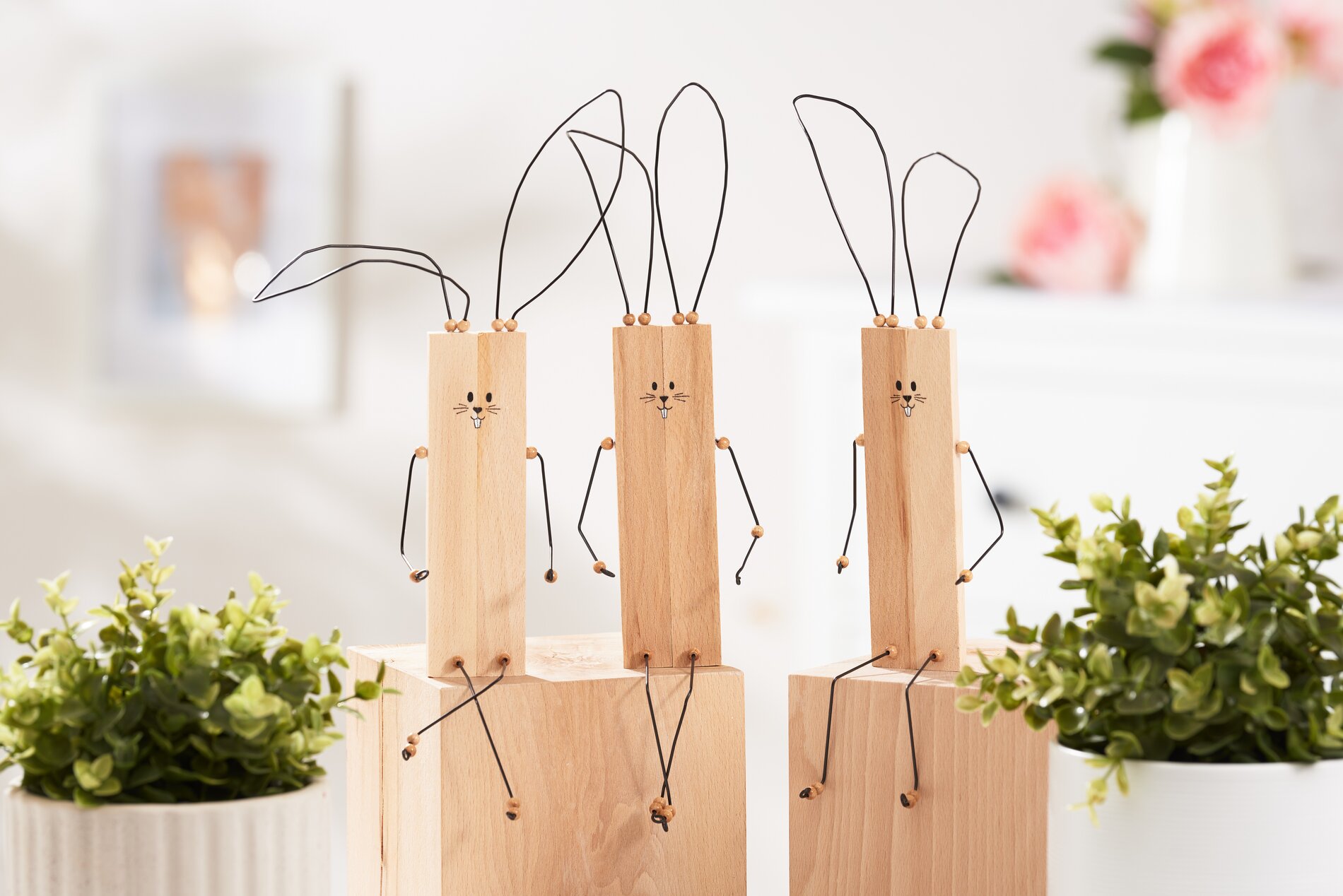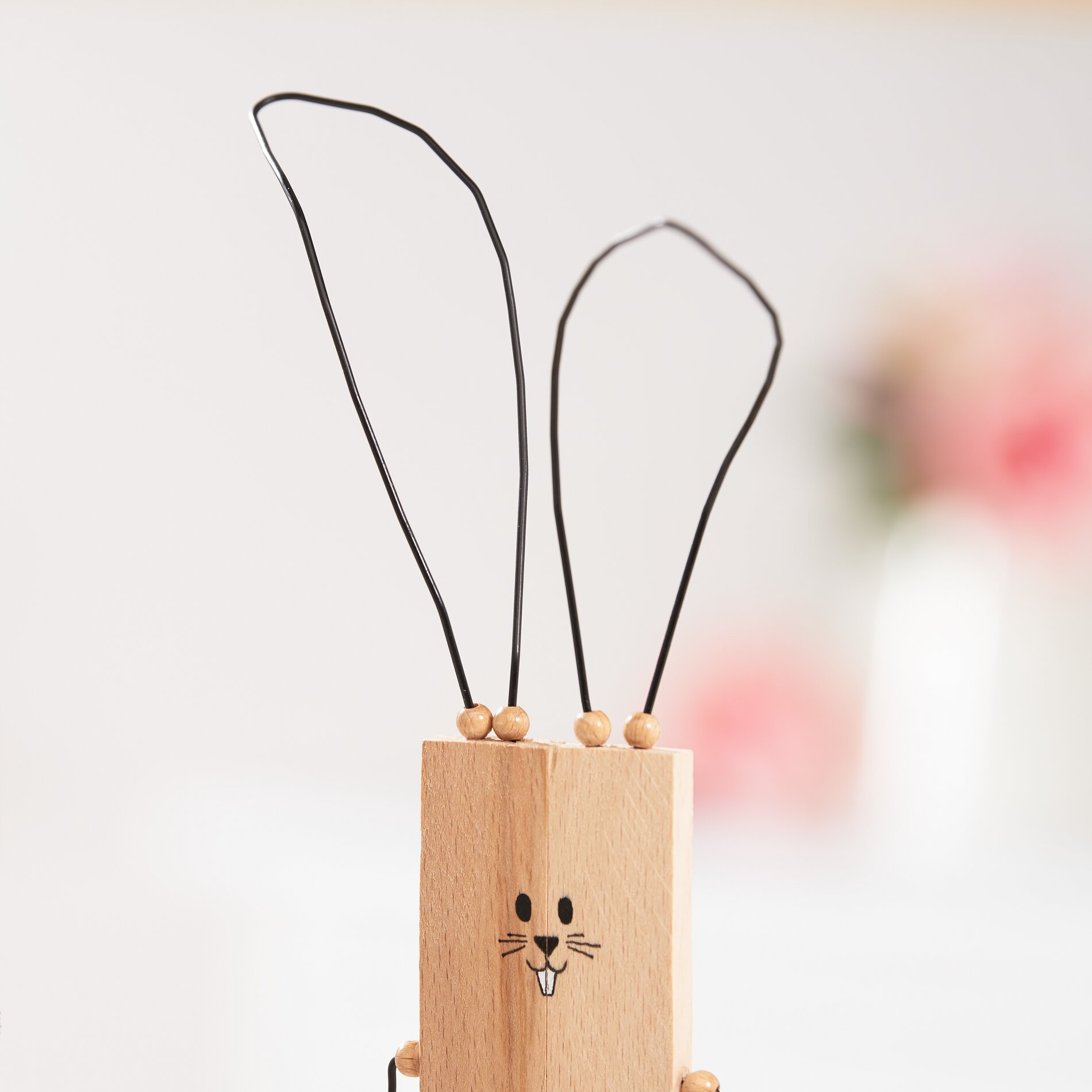 Następnie zagnij jeden koniec kawałków drutu na ręce i nogi, aby były stabilne i nawlecz koraliki. Nadadzą one króliczkom uroczy wygląd. Nadaj drucianym końcówkom uszu pożądany kształt.