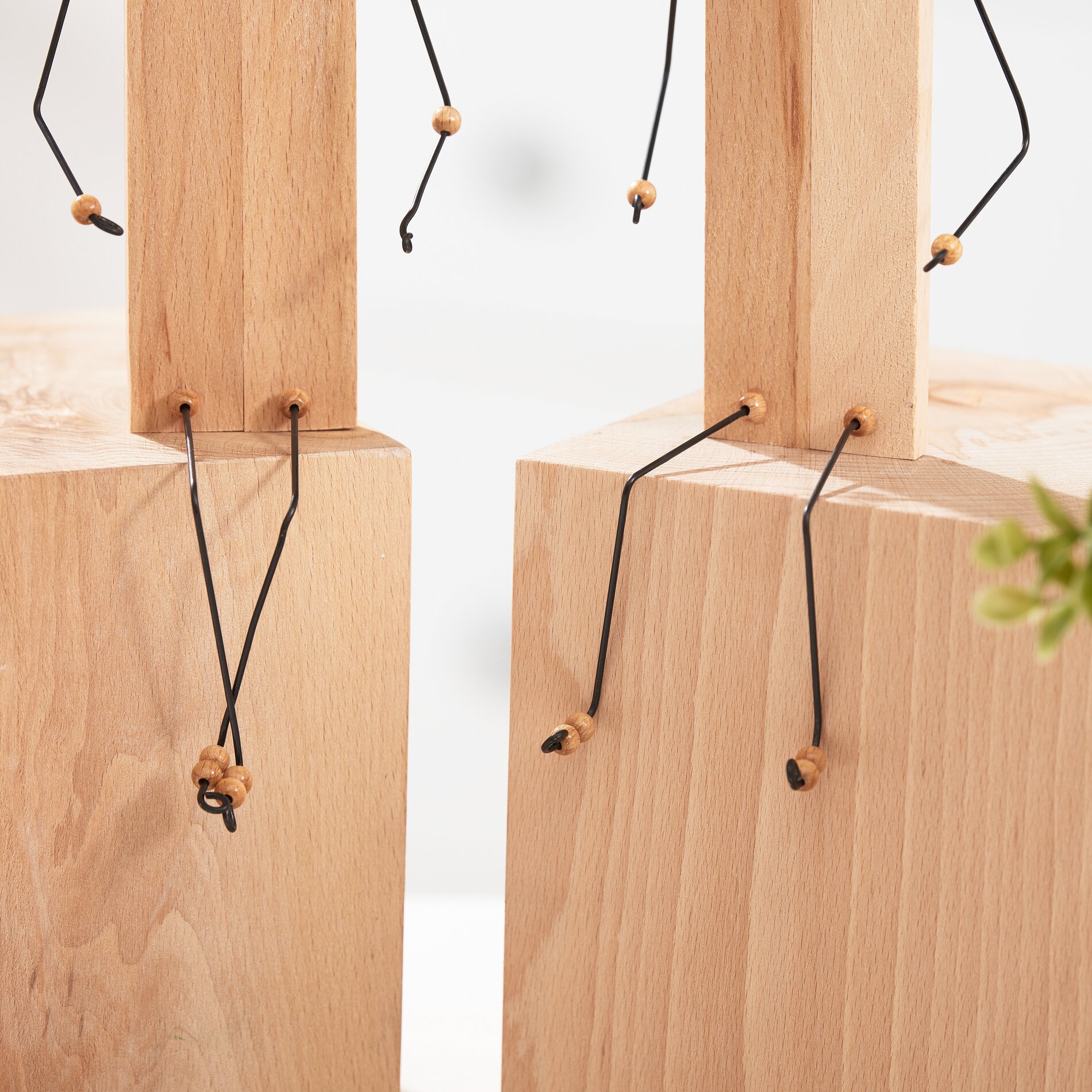 Aby przymocować drut, należy wywiercić kilka otworów w klockach. Wywierć dwa otwory u dołu na nogi i znajdź punkt u góry na wysokości 5,5 cm na ramiona. Na koniec wywierć dwa otwory u góry na każde ucho. Zachowaj ostrożność, aby wszystkie otwory były tego samego rozmiaru, a drut dobrze pasował.