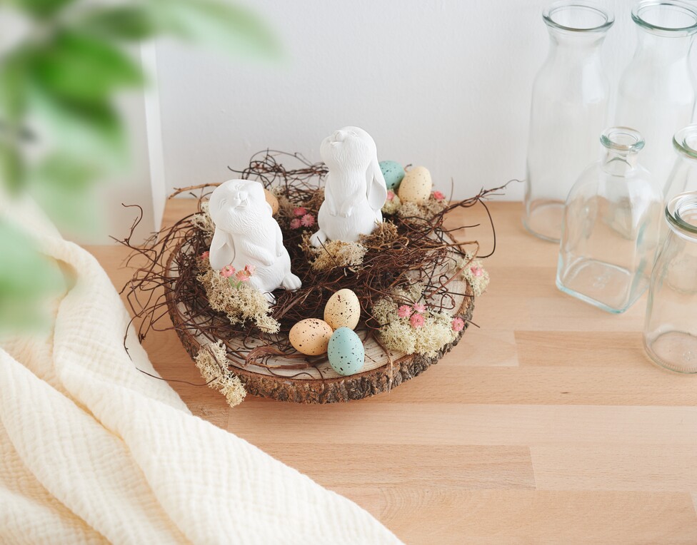 Użyj nożyczek, aby przyciąć gipsówkę do pożądanej długości. Przyklej gipsówkę i ozdobne jajka dekoracyjnie do drewnianego panelu. Proszę rozłożyć je równomiernie, aby uzyskać harmonijny wygląd. Państwa piękna wielkanocna aranżacja jest gotowa!