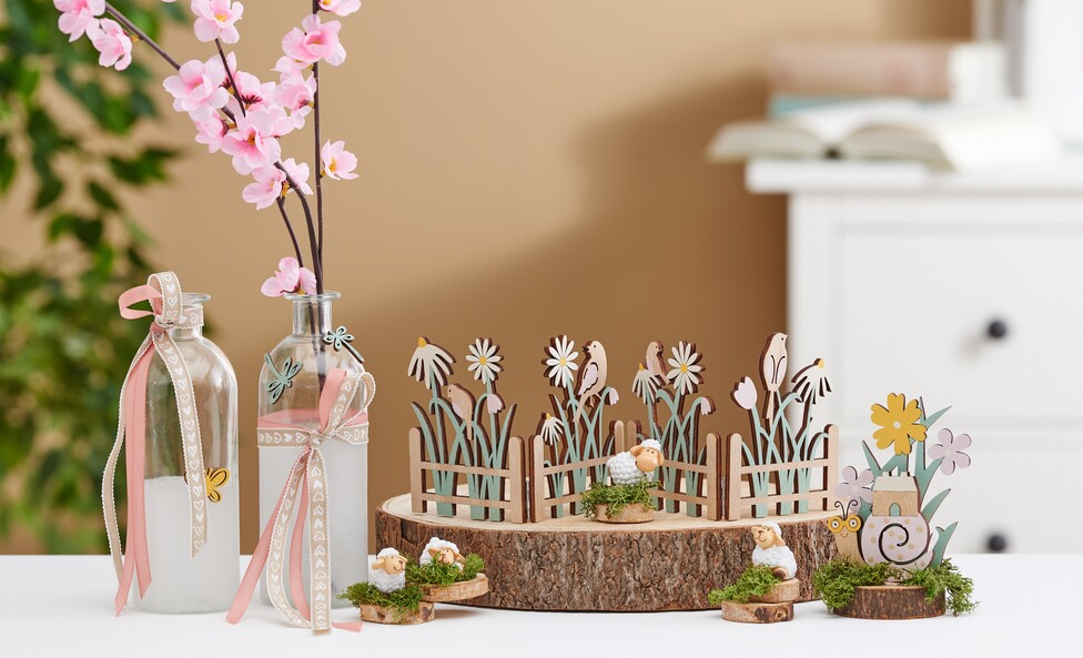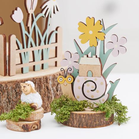 Udekoruj motyw kołka i krążek bydła mchem. Następnie sklej je ze sobą z lekkim przesunięciem i przymocuj do nich owce.