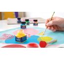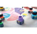 Aplikacja: Genialne farby do malowania tkanin mogą być nakładane bezpośrednio np. za pomocą pędzla. W przypadku szablonowania zalecamy nałożenie kleju w sprayu na szablon, a następnie umieszczenie go na tkaninie, aby zapobiec jego ślizganiu się. Kolor można następnie nałożyć zgodnie z życzeniem, na przykład za pomocą gąbki. Szablon należy usunąć natychmiast po nałożeniu, gdy kolor jest jeszcze mokry. Aby stemplować, wystarczy nałożyć kolor na stempel za pomocą pędzla do tapowania, a następnie lekko docisnąć stempel do tkaniny i ostrożnie usunąć go ponownie.